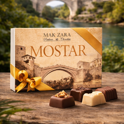 250 grama najfinijih praline u najpopularnijim okusima poput karamela, lješnjaka , pistacije , nutele, oraha, u najkvalitetnijoj belgijskoj mliječnoj, crnoj i bijeloj čokoladi. Bijela bombonjera sa zlatotiskom loga Mak Zara i satenskom mašnom. Idealne su kao poklon dragoj osobi, a uvijek možete odlučiti počastiti i sebe. Handmade 100%.
